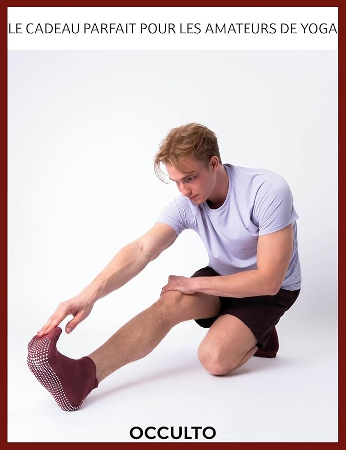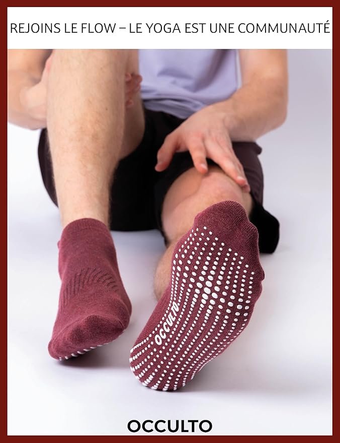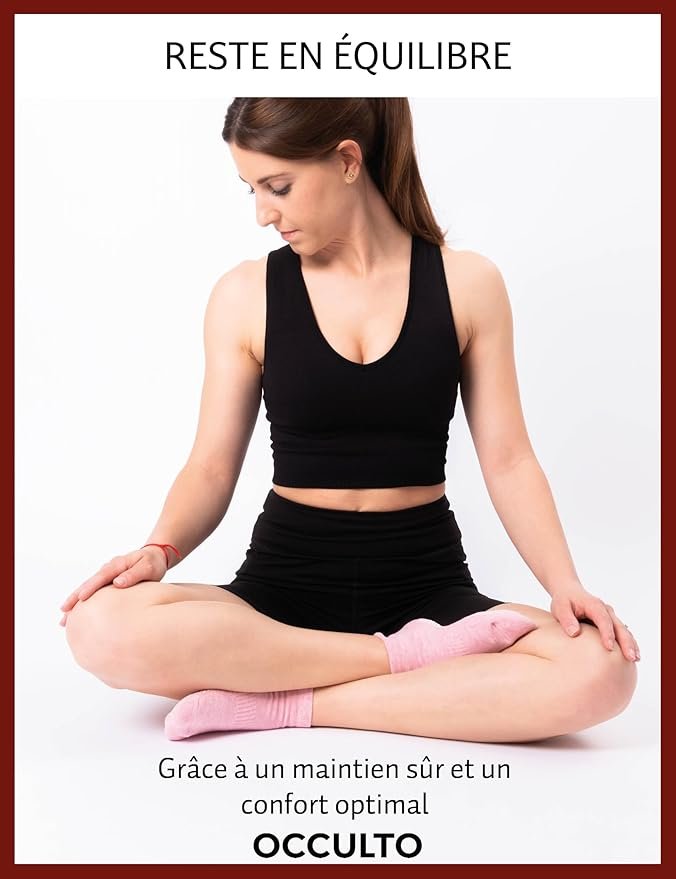 Les chaussettes yoga créent une barrière hygiénique en studio partagé, maintiennent vos pieds au chaud en hiver, et offrent un grip supplémentaire sur surfaces lisses. Les chaussettes Occulto (packs 2 ou 4 paires) sont la référence : picots ABS couvrant toute la surface plantaire, rembourrage stratégique, qualité allemande.
