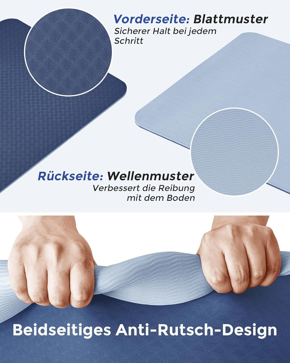 La texture spécialement conçue des deux faces assure une adhérence fiable : grip sous les mains et pieds sur la surface supérieure, adhérence au sol sur la face inférieure. Attention cependant : quelques utilisateurs rapportent un léger glissement avec beaucoup de transpiration. Pour le Hot Yoga, ajoutez une serviette Lotuscrafts Wet Grip par-dessus.